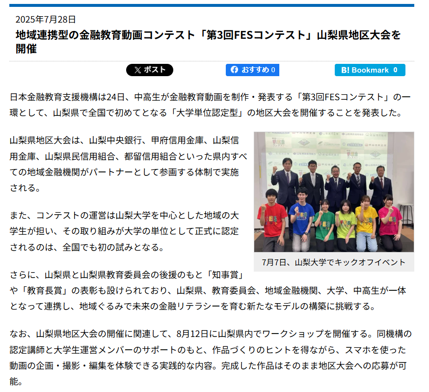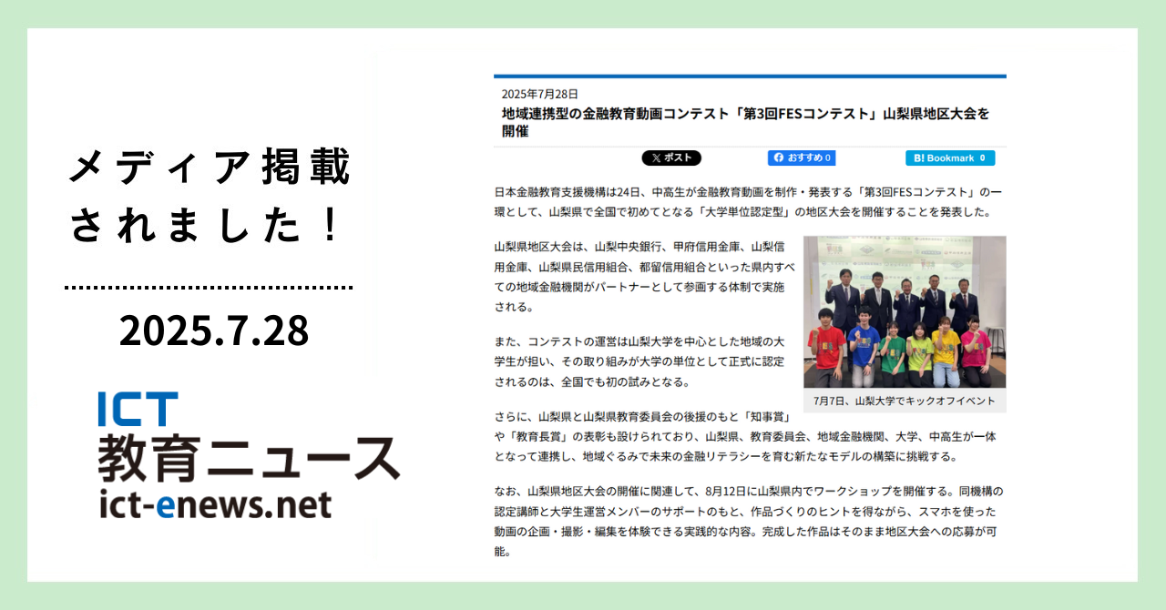 お知らせ 2025年9月19日 faincation-support 2025年7月28日faincation-support「ICT教育ニュース」にFESコンテスト山梨県地区大会について掲載されましたHOMEお知らせ「ICT教育ニュース」にFESコンテスト山梨県地区大会について掲載されました 情報通信技術(ICT)教育関係の情報メディア「ICT教育ニュース」にて、FESコンテスト山梨県地区大会開催についての記事が掲載されました。▼記事リンク地域連携型の金融教育動画コンテスト「第3回FESコンテスト」山梨県地区大会を開催お問合せページ「ICT教育ニュース」にFESコンテスト山梨県地区大会について掲載されましたお名前必須メールアドレス必須お電話番号必須ご質問等Δ 𝕏 コピーしました プレスリリースお知らせ メディア掲載お知らせ FESコンテスト前の記事へ次の記事へ関連記事 【終了しました】東京都武蔵野市:8月16日(土)14:00~ ワークショップ|第3回FESコンテスト パートナー 後援 武蔵野市 武蔵野市教育委員会 1分で伝えるお金の学び!あなたの発想がみんなのチカラに! 金融の学びを自分の考えで整理し、幅広い世代の学びとなる金融教育動画を制作し応募するFESコンテスト。ワークショップ「FESコンテストへの道」では、お金のさまざまな機能を…… 【終了しました】東京都板橋区:8月19日(火)14:00~ ワークショップ|第3回FESコンテスト 後援: 1分で伝えるお金の学び!あなたの発想がみんなのチカラに! 金融の学びを自分の考えで整理し、幅広い世代の学びとなる金融教育動画を制作し応募するFESコンテスト。ワークショップ「FESコンテストへの道」では、お金のさまざまな機能を「お金の8つの力」として学んだあとFESコンテストの応募作品(金融教育の…… 群馬県:8月25日(日)14:00~ ワークショップ|第2回FESコンテスト 協賛 山田税理士事務所 協力 PCアルターナ 後援 群馬県 群馬県教育委員会 前橋市教育委員会 ワークショップで学ぼう「お金の力」、挑戦しよう「金融教育」! あなたの作品がみんなの”お金を学ぶきっかけ”になる「FESコンテスト」。第2回大会の開催に向けてワークショ…… 金融教育を自分ごとに!中高生が小学生向けに金融教育動画を考案した、第1回「FESコンテスト」表彰式を開催! 全国42校、156作品の頂点が決定! 東京都、消費者庁、大阪・関西万博の後援で表彰式を実施しました 一般社団法人日本金融教育支援機構(代表理事:平井梨沙、所在地:東京都中央区、以下「当機構」)は、“金融教育を自分ごととして考える”を目的として、大学生が主導し、中高生が小学生のための金融教育動画を制作し、賞を競うコンテスト である第1回「FESコンテス……