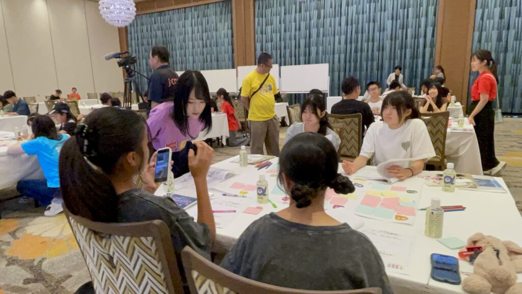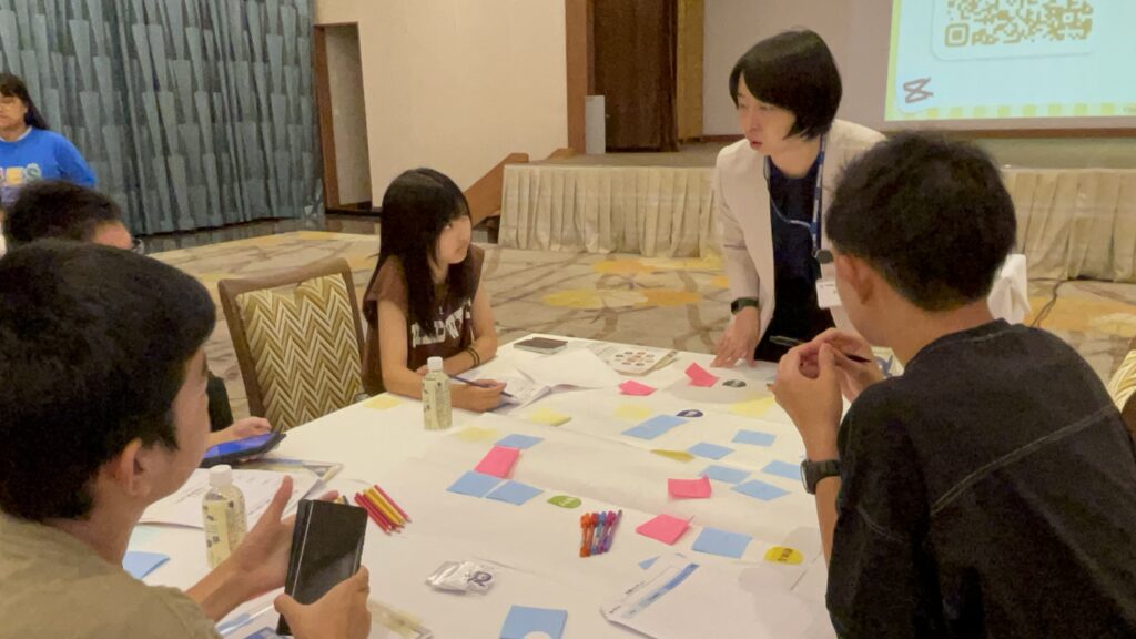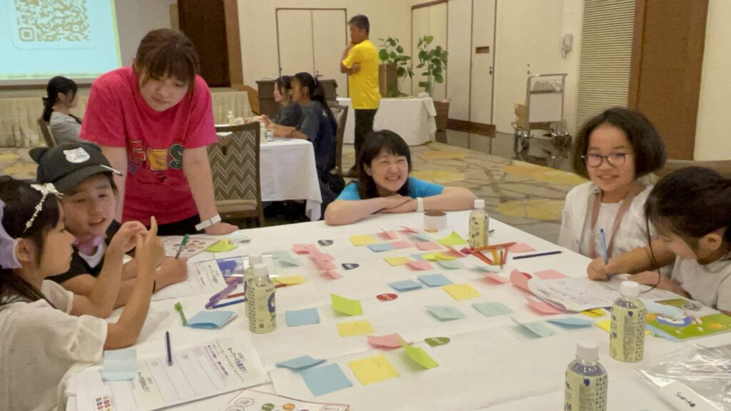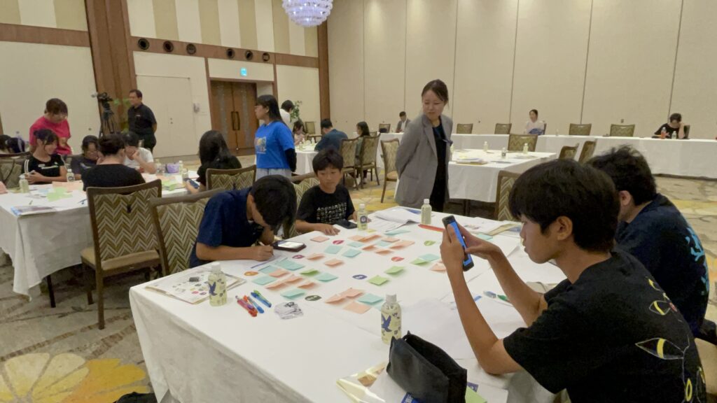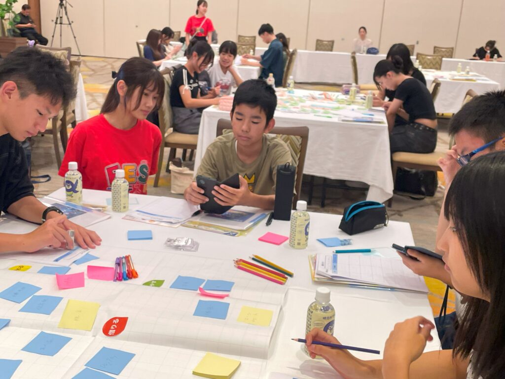 当日は、小中高生を中心に初対面の参加者も多く、少し緊張した空気の中でスタートしました。まずは、「FESコンテスト」の説明動画を鑑賞し、今後のスケジュールや賞の種類を紹介しました。また、グループワークを円滑に進めるため、自己紹介も実施。「学校・学年・名前・100万円あったらどう使うか」といった項目を順に話すことで、初対面の参加者同士も自然と笑顔になり、和やかな雰囲気の中でワークショップが始まりました。