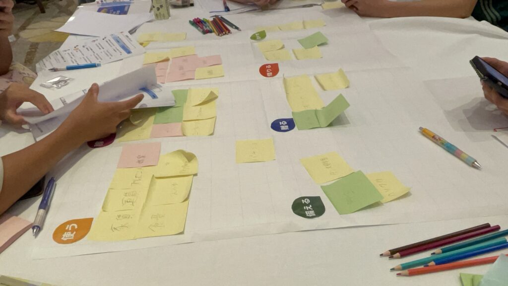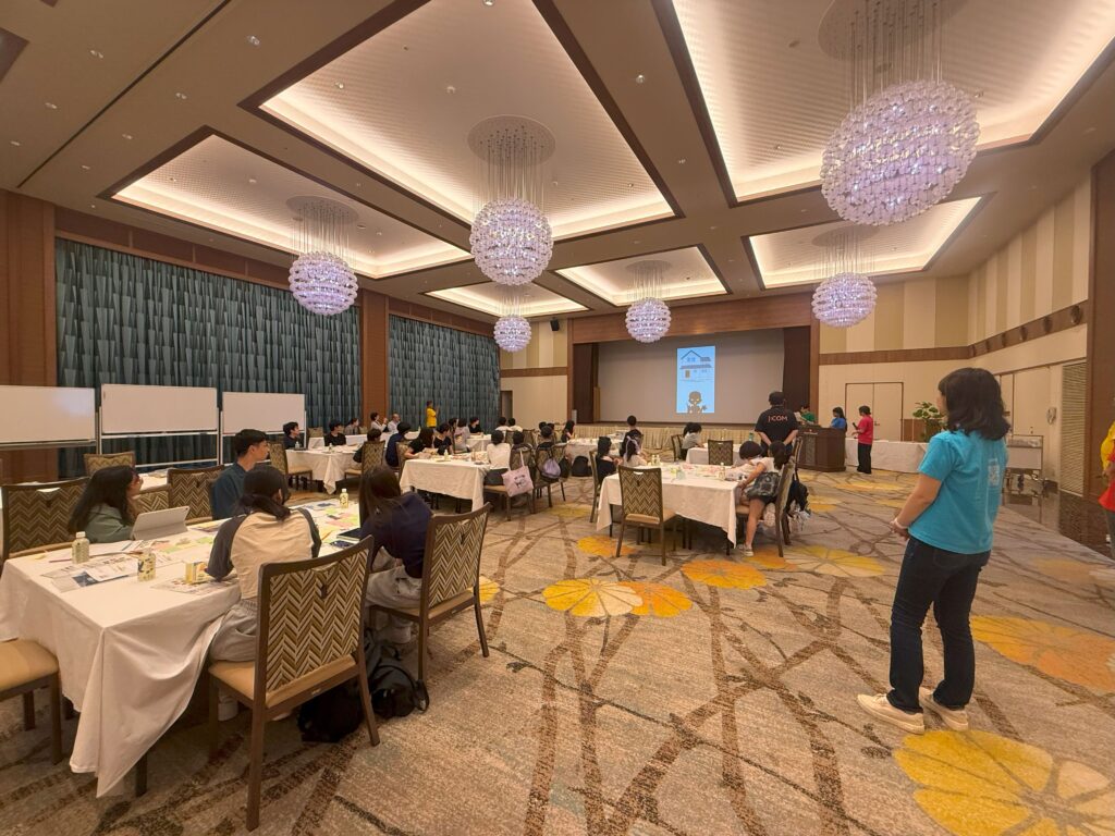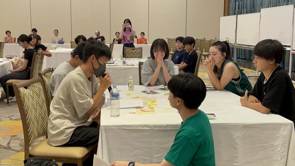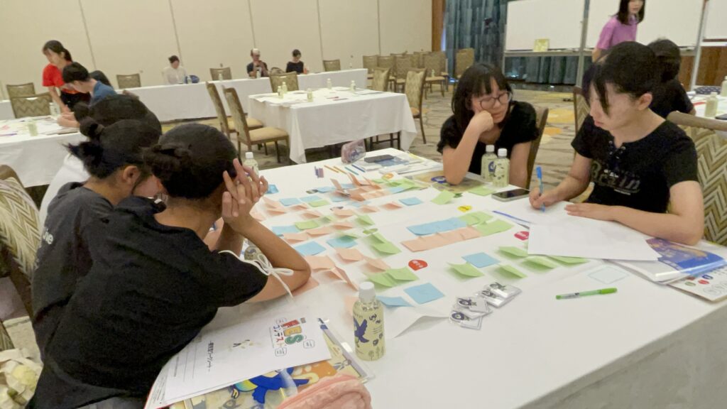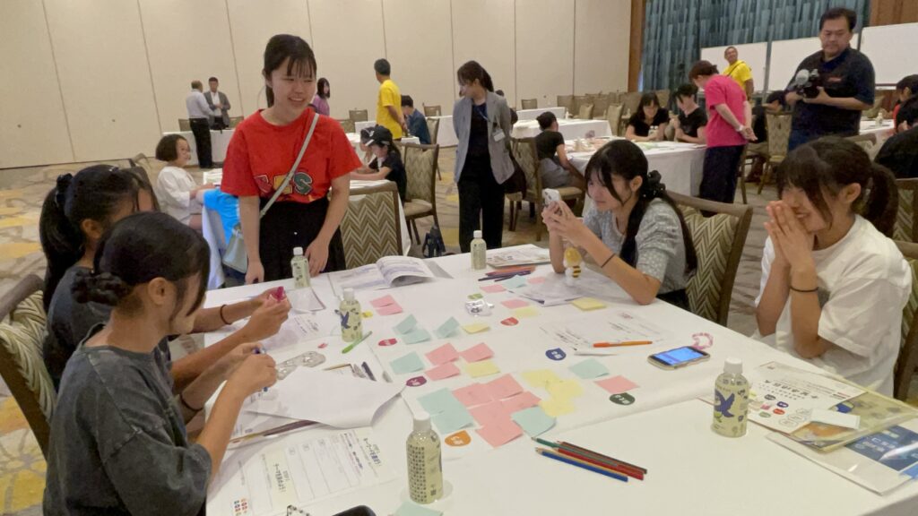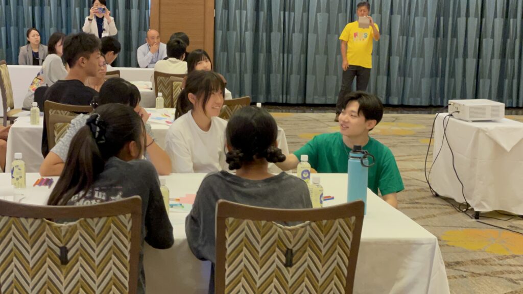 当日は、小中高生を中心に初対面の参加者も多く、少し緊張した空気の中でスタートしました。まずは、「FESコンテスト」の説明動画を鑑賞し、今後のスケジュールや賞の種類を紹介しました。また、グループワークを円滑に進めるため、自己紹介も実施。「学校・学年・名前・100万円あったらどう使うか」といった項目を順に話すことで、初対面の参加者同士も自然と笑顔になり、和やかな雰囲気の中でワークショップが始まりました。