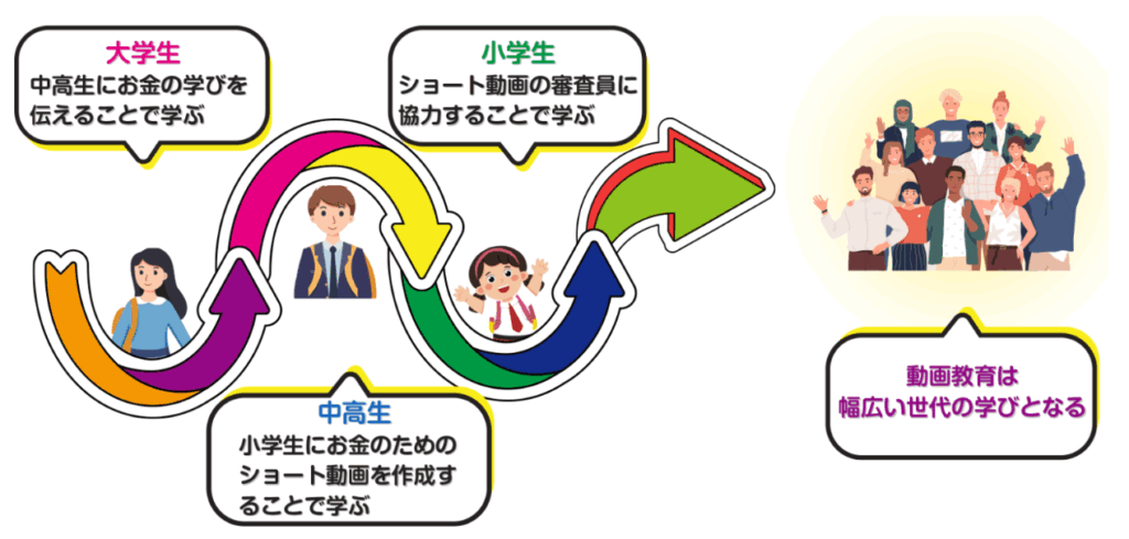 中高生が、お金の8つの力(使う・稼ぐ・納める・貯める・備える・贈る・借りる・増やす)をテーマに、小学生にも伝わることばで、幅広い世代の学びとなる金融教育動画を制作し、大学生が運営をサポートする、「学生の、学生による、学生のためのコンテスト」です。