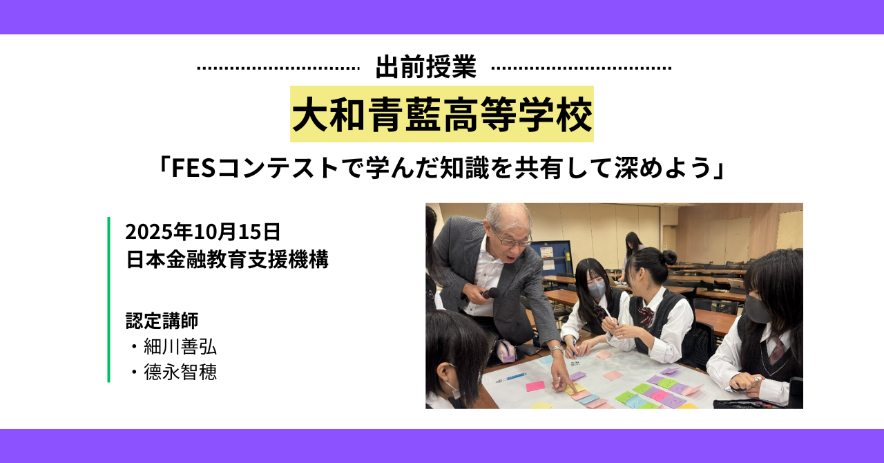 担当教員の松村先生からは「生徒たちはFESコンテストの動画制作に取り組み、金融に関する知識を自分達なりに調べた後ということもあり、グループワークで皆積極的に発言をしていて大きな成長を感じました」とご好評いただきました。