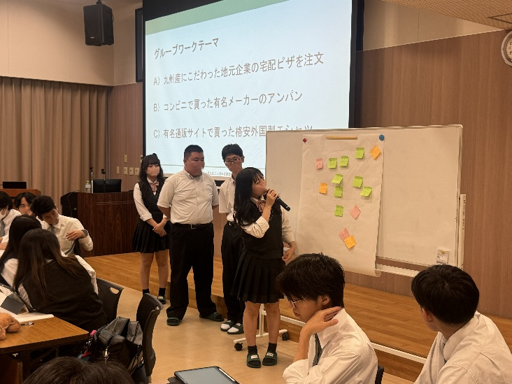 2時限目のワークでは、「九州産にこだわった地元企業の宅配ピザを注文」「コンビニで買ったあんパン」「有名通販サイトで購入した格安Tシャツ」の3つのテーマをグループごとに割り当てました。