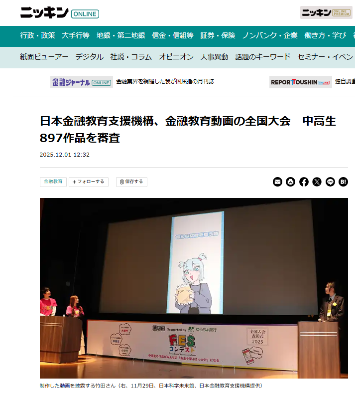 2025年12月1日、金融・金融機関の最新ニュースを伝える「ニッキンONLINE」にて、11月29日に開催された「第3回FESコンテスト Supported by ゆうちょ銀行」(全国大会)表彰式の記事が掲載されました。