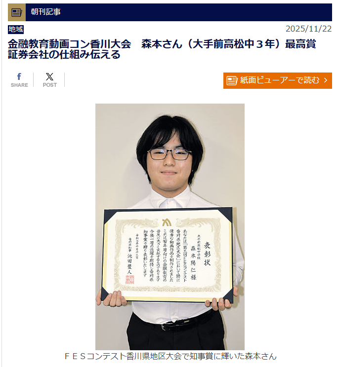 記事では、大手前高松中学校3年の森本陽仁さんが制作した動画「教えておじいちゃん!」が最高賞(知事賞)を受賞したこと、証券会社の仕組みを小学生にもわかりやすい対話形式で表現した内容が取り上げられています。