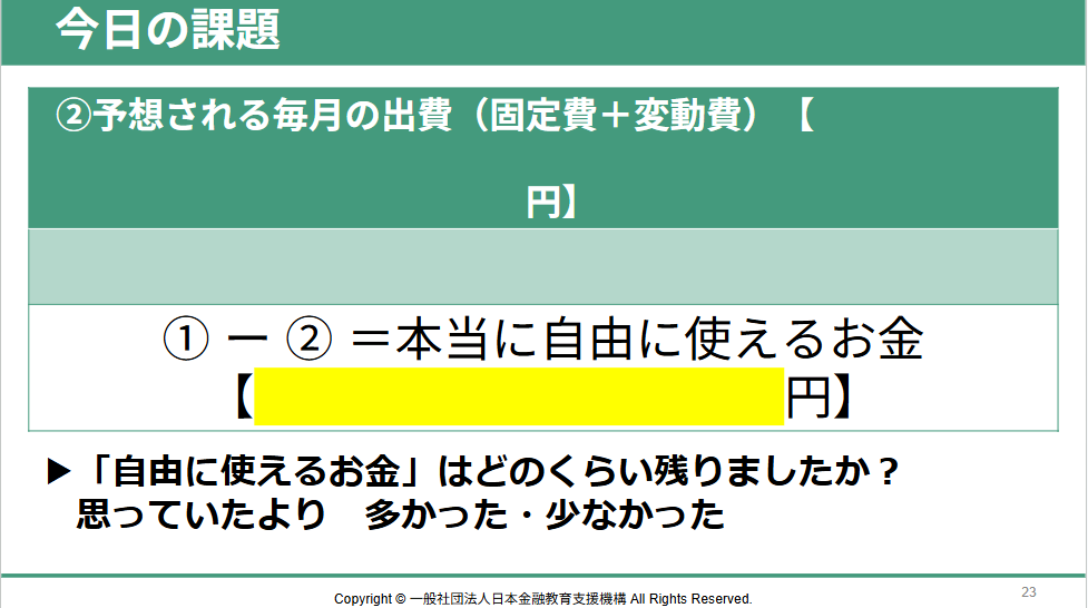 授業の様子:後半「生活費シミュレーション「家計管理ワーク」