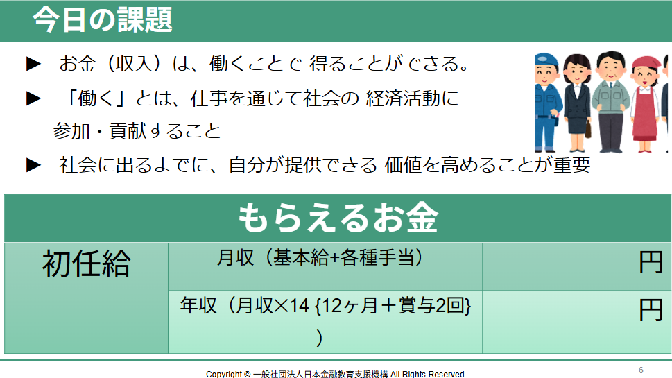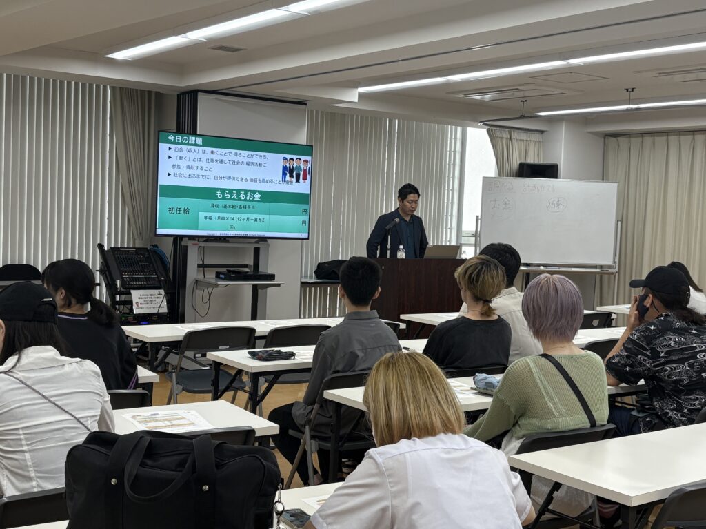 前半では「働くことの意義」を考え、初任給の仕組みについて学習。額面給与から税金や社会保険料が約20%引かれる「手取り収入」の現実に、生徒たちからは驚きの声が上がりました。