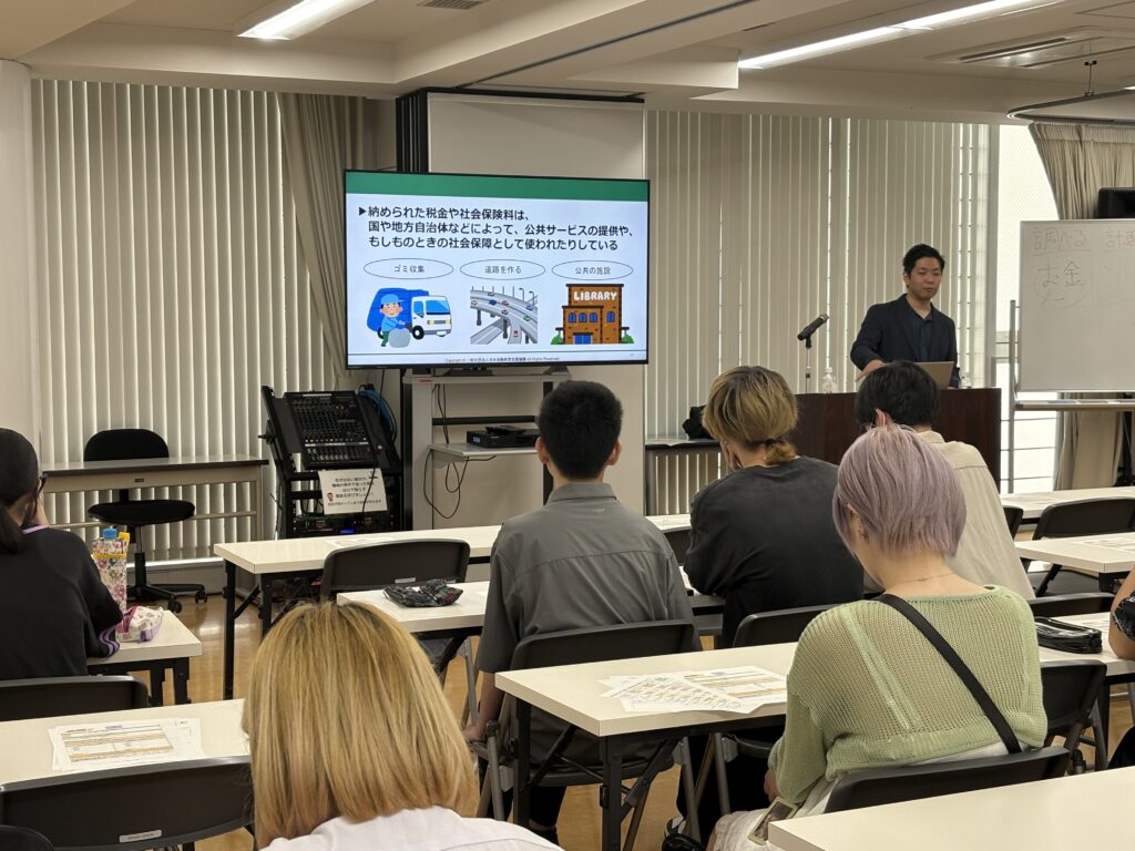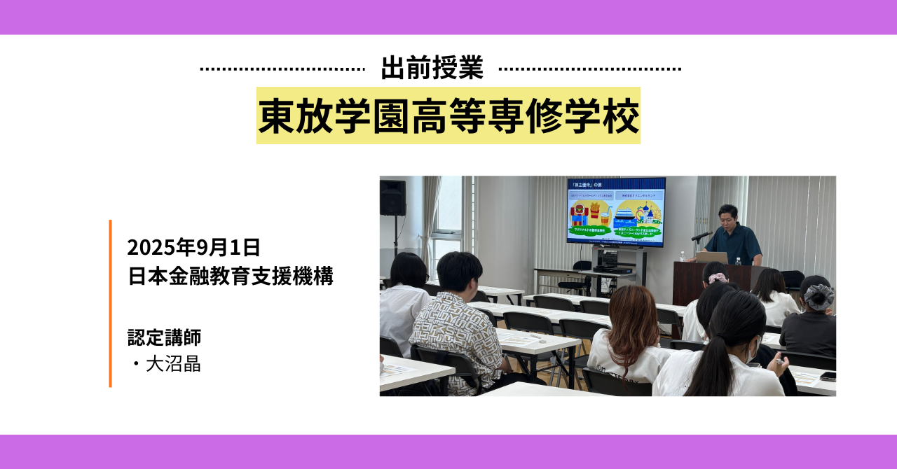 2025年9月1日、東放学園高等専修学校の生徒約40名を対象に、東京都講師派遣による金融教育授業を行いました。当機構認定講師から、メイン講師・大沼晶、サブ講師・広川明雄が登壇しました。