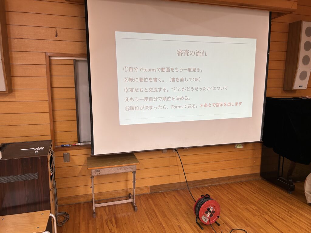 授業では、まず審査の方法や評価の視点について説明した後、昨年度の応募動画をすべて視聴し、順位付けを行いました。評価とその理由はMicrosoft Formsを活用して回答し、一人ひとりが自分の考えを整理しながら意見を表現できるよう工夫しました。