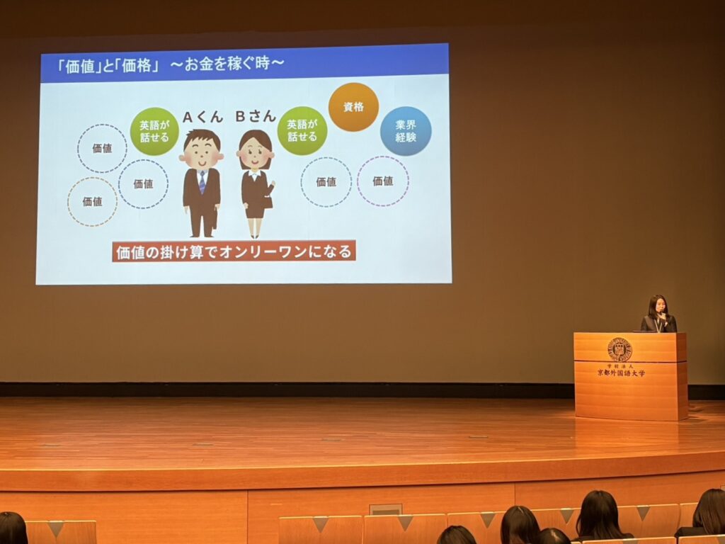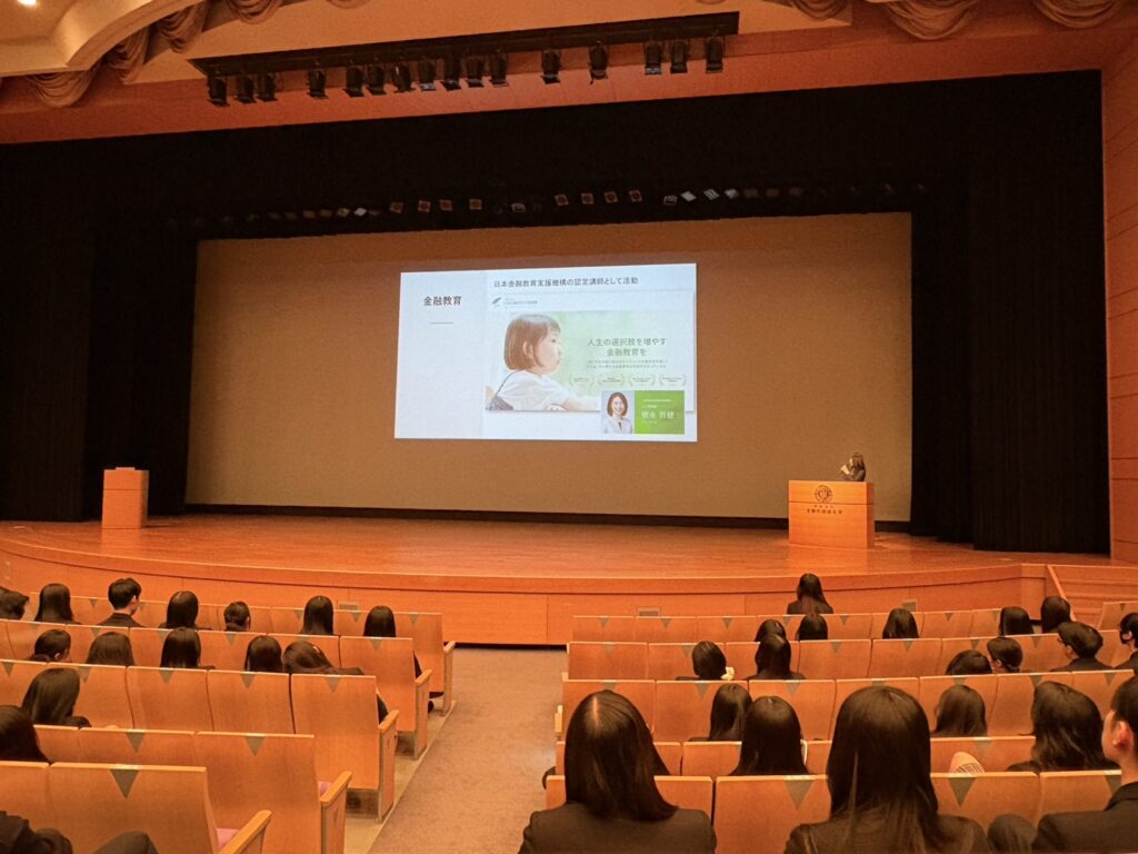 2025年12月12日、京都外大西高等学校・国際文化コース1〜3年生の6クラスを対象に金融教育の講演会を実施。当機構認定講師・德永智穂が登壇しました。