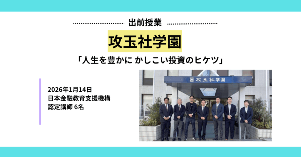 2026年1月14日、東京都の講師派遣事業にて攻玉社高等学校で「人生を豊かに かしこい投資のヒケツ」と題して金融教育出前授業を実施。高校1年生の6クラスで同時に授業を行い、講師として鬼丸正彦、朽網哲朗、秋葉裕幸、永田真仁 … 続きを読む 東京都の講師派遣事業で「攻玉社中学校・高等学校」高校1年生に金融教育出前授業を実施