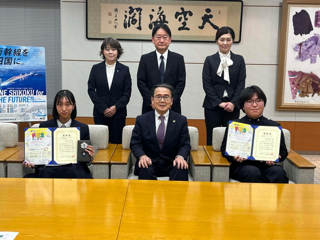 今回の訪問は、昨年10月の香川県地区大会を経て、11月の全国大会で見事上位入賞を果たした2名の生徒たちの成果を称えるものです。