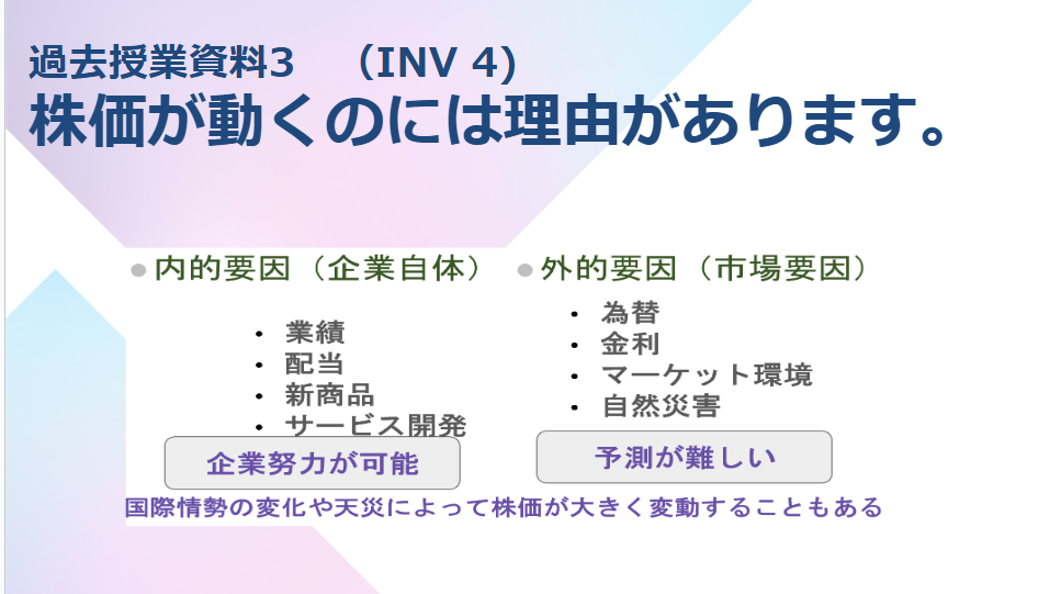 を体験的に学習。市場環境の変化によって結果が変わることから、投資には「正解が一つではない」こと、そして感情に流されず考えることの大切さを実感しました。