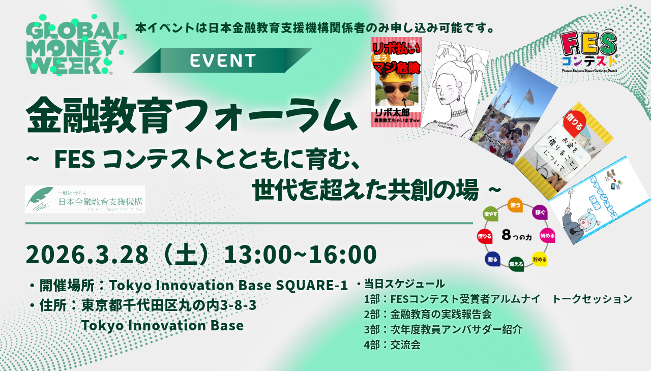 日本金融教育支援機構は、金融庁等が参画するグローバル・マネー・ウィーク(Globan Money Week)に賛同し、若年者向けの金融教育に関する取り組みとして「金融教育フォーラム~FESコンテストとともに育む、世代を超えた共創の場~」を開催いたします。