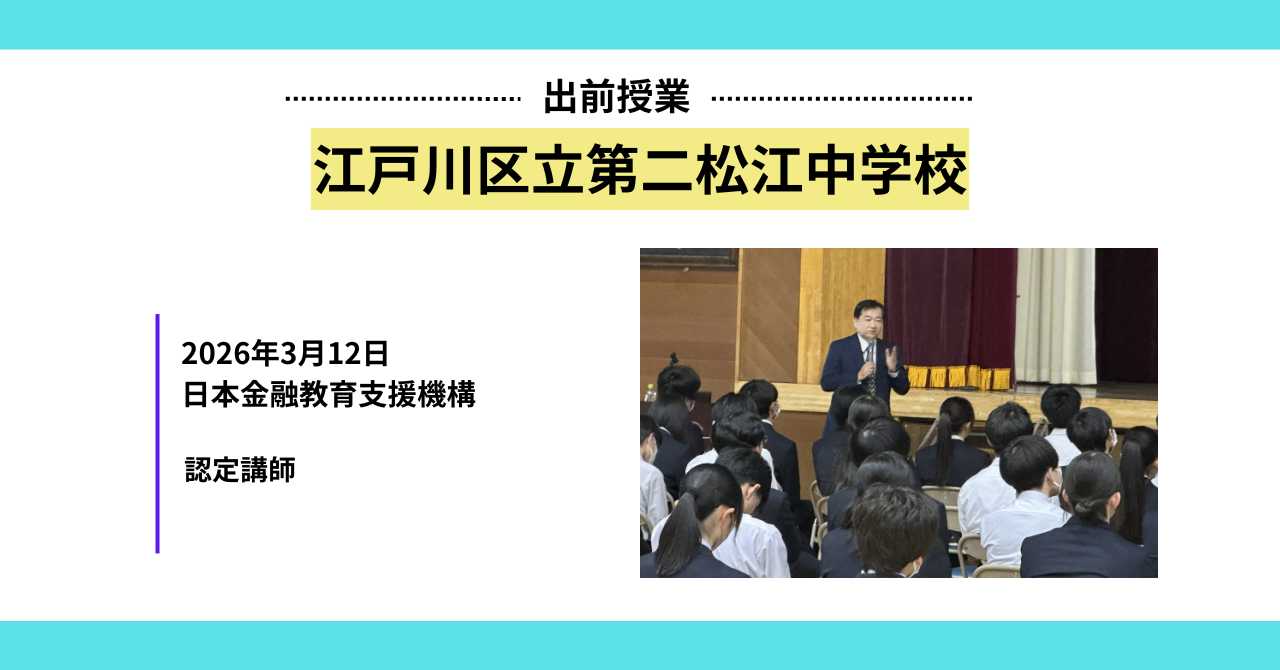 2026年3月12日、東京都江戸川区立第二松江中学校にて金融教育授業を実施しました。授業は体育館にて3クラス合同で行われ、約102名の生徒が参加しました。講師を広川明雄が務めました。