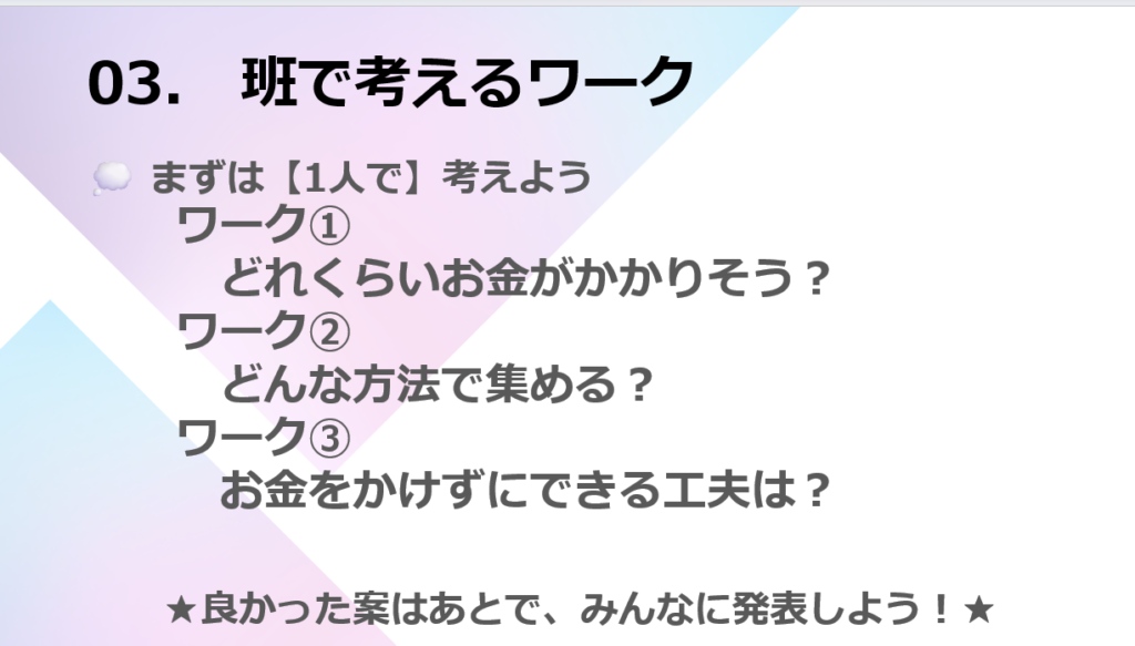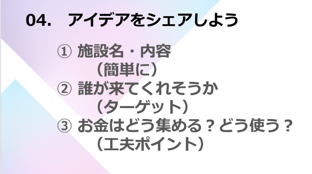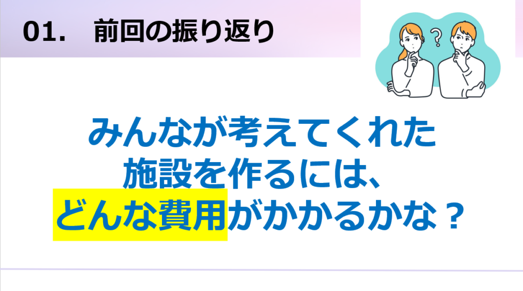グループワークでは、生徒たちが班ごとに分かれ、必要資金の規模や調達方法、コスト削減の工夫について議論。その後の発表では、施設の内容やターゲット、資金の集め方・使い方について、多様なアイデアが共有されました。