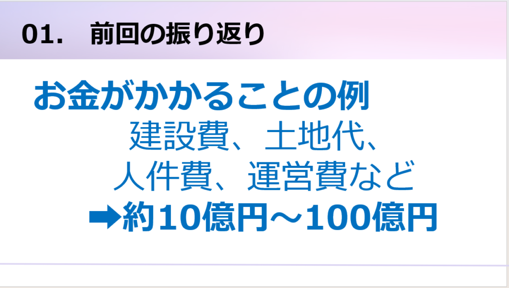 授業では、生徒自身が考えた「地域に必要な施設」を題材に、その実現に必要となる資金規模や資金調達の方法について考察。建設費・土地代・人件費・運営費などを踏まえると、施設の実現には約10億円〜100億円規模の費用がかかる可能性があることを学びました。
