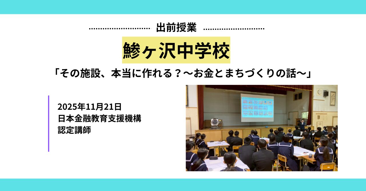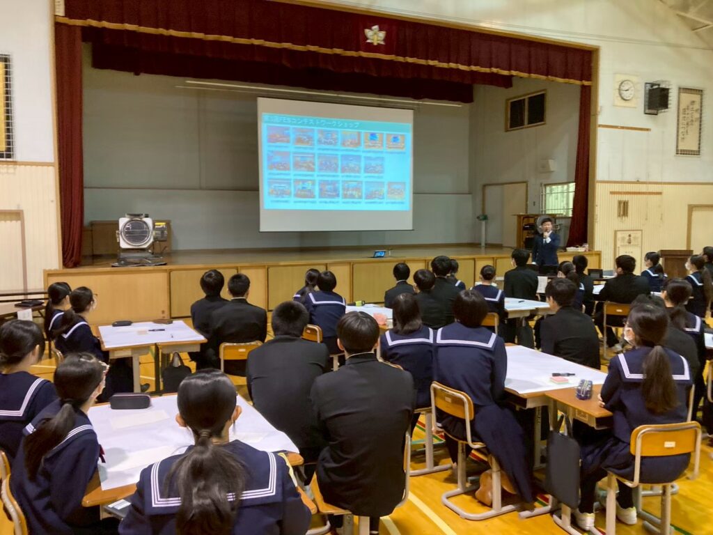 2025年11月21日、鯵ヶ沢町立鯵ヶ沢中学校にて「その施設、本当に作れる?〜お金とまちづくりの話〜」と題し、3年生61名を対象に50分×2コマの構成で出前授業を実施しました。講師は中園和博、岩谷陽司が務めました。