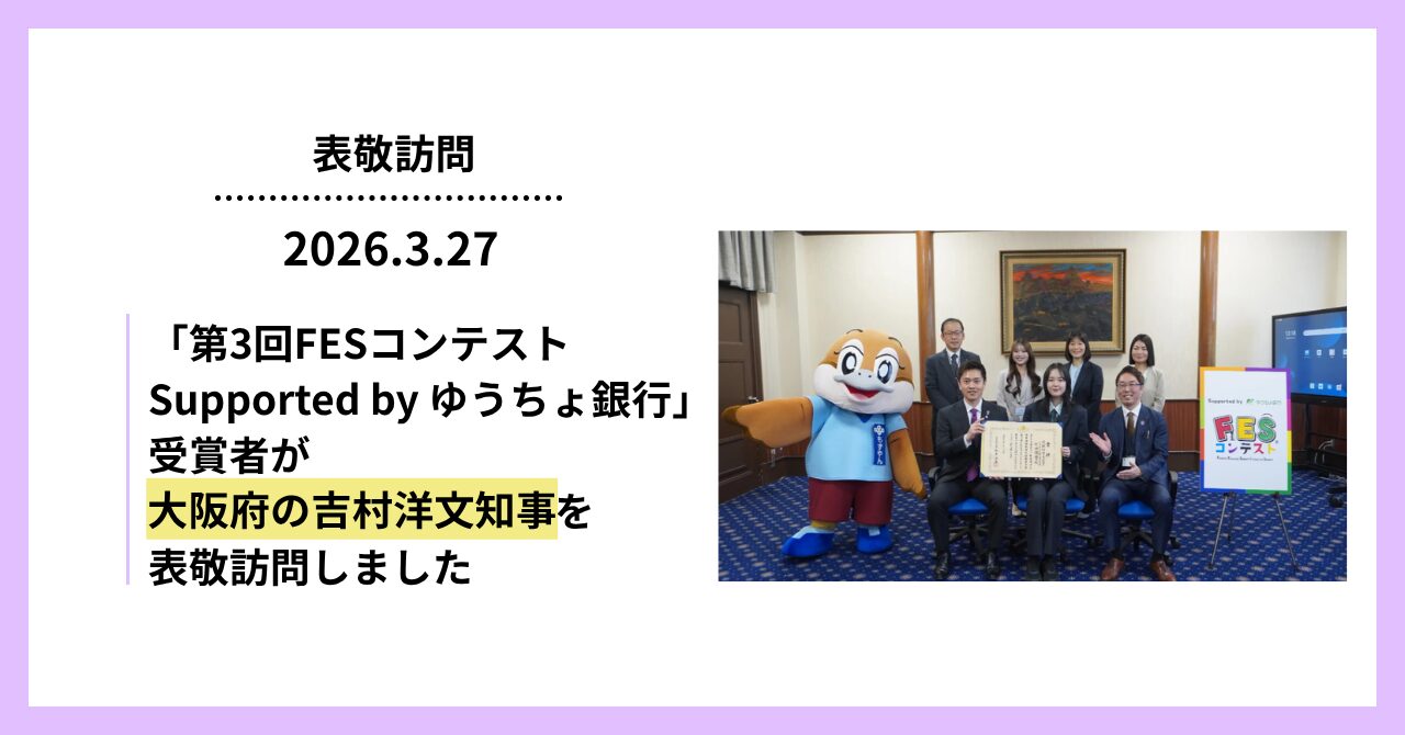 2026年3月27日、「第3回FESコンテストSupported by ゆうちょ銀行」で文部科学大臣賞を受賞した、大阪府立長野高等学校の竹田陽響さんが大阪府の吉村洋文知事を表敬訪問し、全国での成果を報告しました。