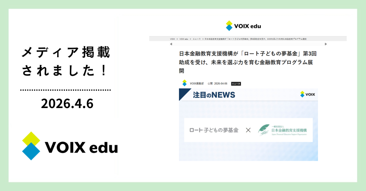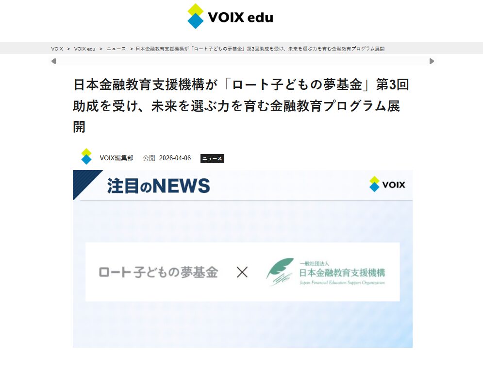 2026年4月6日、ニュースメディア「VOIX」の【注目NEWS】として、当機構の「ロート子どもの夢基金」第3回助成採択が取り上げられました。