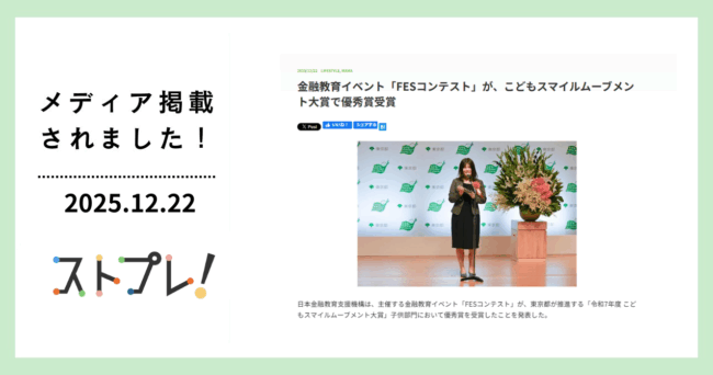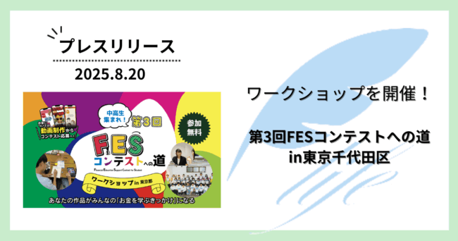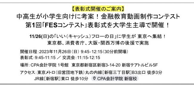 お知らせ 2025年5月27日 faincation-support 2023年6月8日faincation-support「FESコンテスト」運営委員募集のお知らせHOMEお知らせ「FESコンテスト」運営委員募集のお知らせ 運営委員の大学生を募集します!「FESコンテスト」とは、Financial Education Support Contest の略で、中高校生が小学生のために、お金が中心の金融教育ではなく「人が中心の金融教育」をわかりやすく説明するための動画を制作し、賞を競うコンテストになります。詳しくはこちら お問合せページ「FESコンテスト」運営委員募集のお知らせお名前必須メールアドレス必須お電話番号必須ご質問等Δ 𝕏 コピーしました FESコンテスト前の記事へ次の記事へ関連記事 第3回「FESコンテスト」地区大会受賞作品を公開しました! 2025年11月29日に「第3回 FESコンテスト Supported by ゆうちょ銀行」全国大会表彰式を開催し、第3回FESコンテストのすべての日程を終了いたしました。 全国大会の受賞作品に続き、全国10ヵ所で開催した地区大会の受賞作品をホームページ上に公開しましたので、ご覧ください。 作品ページはこちら [contact-for…… 「ICT教育ニュース」にFESコンテスト山梨県地区大会について掲載されました 情報通信技術(ICT)教育関係の情報メディア「ICT教育ニュース」にて、FESコンテスト山梨県地区大会開催についての記事が掲載されました。 ▼記事リンク地域連携型の金融教育動画コンテスト「第3回FESコンテスト」山梨県地区大会を開催 [contact-form-7 id="8ea8604" title="投稿用お問い合わせ"] …… 開催報告:「キッズ社長への挑戦状!ご当地お弁当をヒットさせるのはキミだ!? in淡路市」ワークショップを開催 8月23日(日)、兵庫県淡路市の淡路市立サンシャインホールで、小学生を対象にしたワークショップ型イベント「キッズ社長への挑戦状!ご当地お弁当をヒットさせるのはキミだ!?」を開催しました。本イベントは、積水ハウス株式会社様による「積水ハウスマッチングプログラム」の助成を受けて実施されたものです。 テーマは、淡路市の特産品を使った「ご当地お弁当」。「アン…… 【文部科学省後援】あなたの作品がみんなの「お金を学ぶきっかけ」になる!「FESコンテスト」の第3回開催が決定 今年は文部科学省の後援も決定!第2回大会は、1都19県から503作品の応募 一般社団法人日本金融教育支援機構(代表理事:平井梨沙、所在地:東京都千代田区、以下「当機構」)は、日本最大級の金融教育の祭典である、「FESコンテスト®」の全国大会と地区大会を今年も開催いたします。 また、第1回の消費者庁、第2回の金融庁に続き、今大会において新……